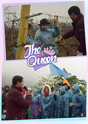 瞧!各組的造型精彩紛呈,無不展示著他們必勝的決心。天空雖然下起了毛毛細(xì)雨,大家穿起雨衣,卻無形中統(tǒng)一了服裝,干農(nóng)活抱枝條,也不會(huì)弄臟衣服了。