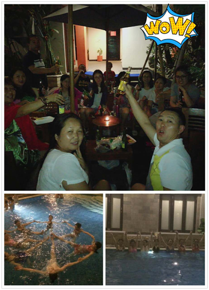 除了巴厘島景點的游玩,集團(tuán)人力行政部還在異國他鄉(xiāng)的星空下組織了一場別有新意的“泳池趴”。集團(tuán)的“娘子軍們”還表演了高難度的“花樣游泳”,小伙伴們圍坐在泳池邊談笑風(fēng)生,分享著本次旅游中的感動:大家一同照顧、陪伴不服水土身體出狀況的同事;為遇到困難的同事們出謀劃策、一起想辦法;一起分享彼此的喜悅和感動…… 暢談、暢飲、暢懷中,都透著對美好生活的感恩、對集團(tuán)關(guān)懷的感恩,對同事間互幫互助的感恩!