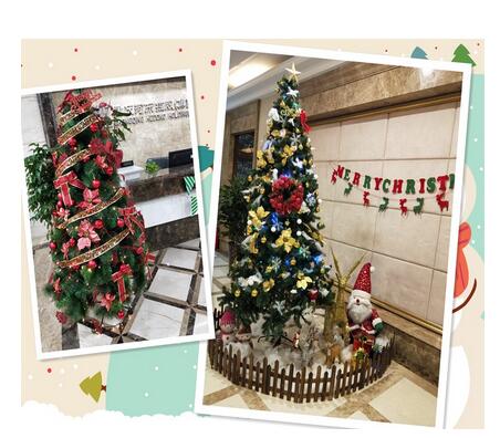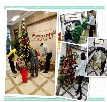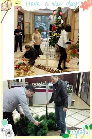 集團(tuán)行政部有兩位男士,袁師傅和王歡又是搬運(yùn),又是支架固定圣誕樹,女士們掛裝飾品.清潔楊阿姨看到了,也熱情的來幫忙,清潔上面的灰塵,為我們遞裝飾物.人多力量大,不一會兒,一樓大廳以及六樓前臺的兩棵金光閃閃的圣誕樹便呈現(xiàn)在我們眼前了,滿滿的成就感,嘻嘻……